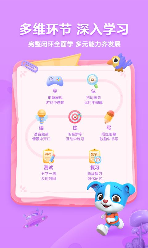 精选1300字、5200词,覆盖小学低年级语文新课标;三段式课程设计,满足不同年龄段识字需求。