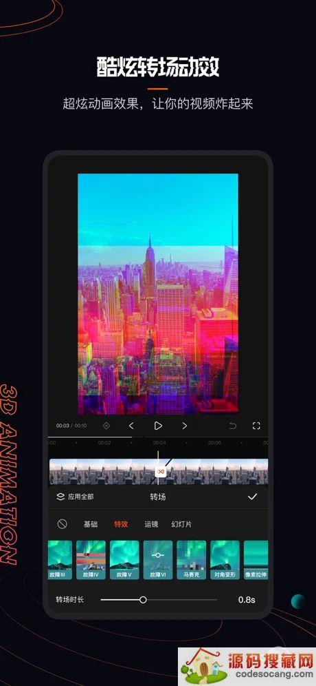 「转场」支持叠黑、闪白、叠化、眩晕和震荡等高级转场。