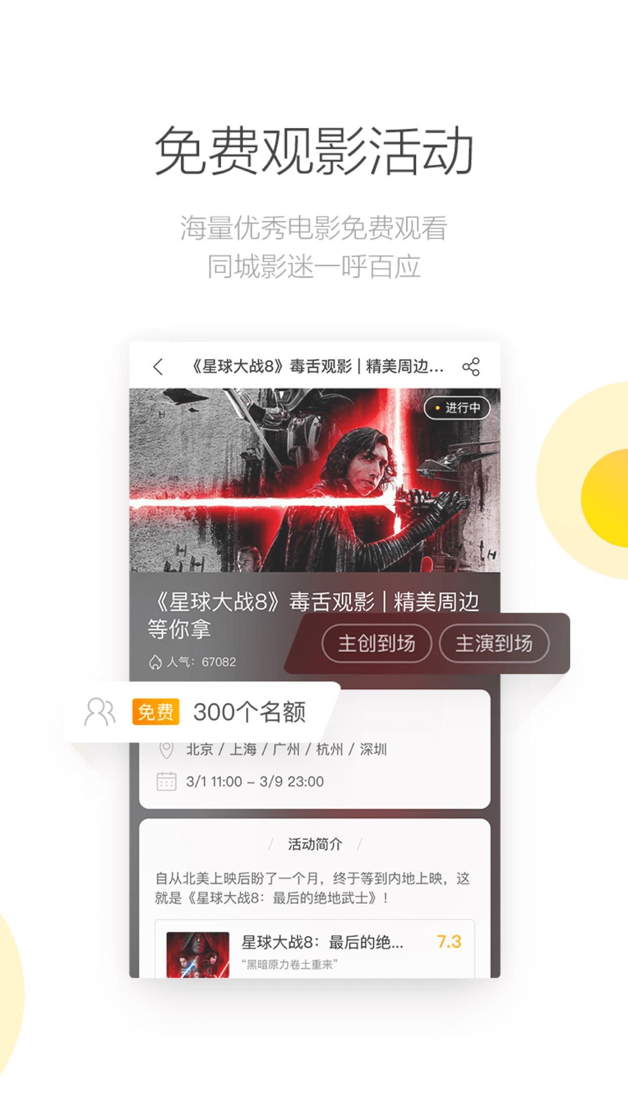 全年300+场免费超前点映,同城影迷聚会见明星!每周有活动,报名到手软!最近举办:《生存家族》《复仇者联盟3》《头号玩家》《中邪》 等高分影片超前点映活动。