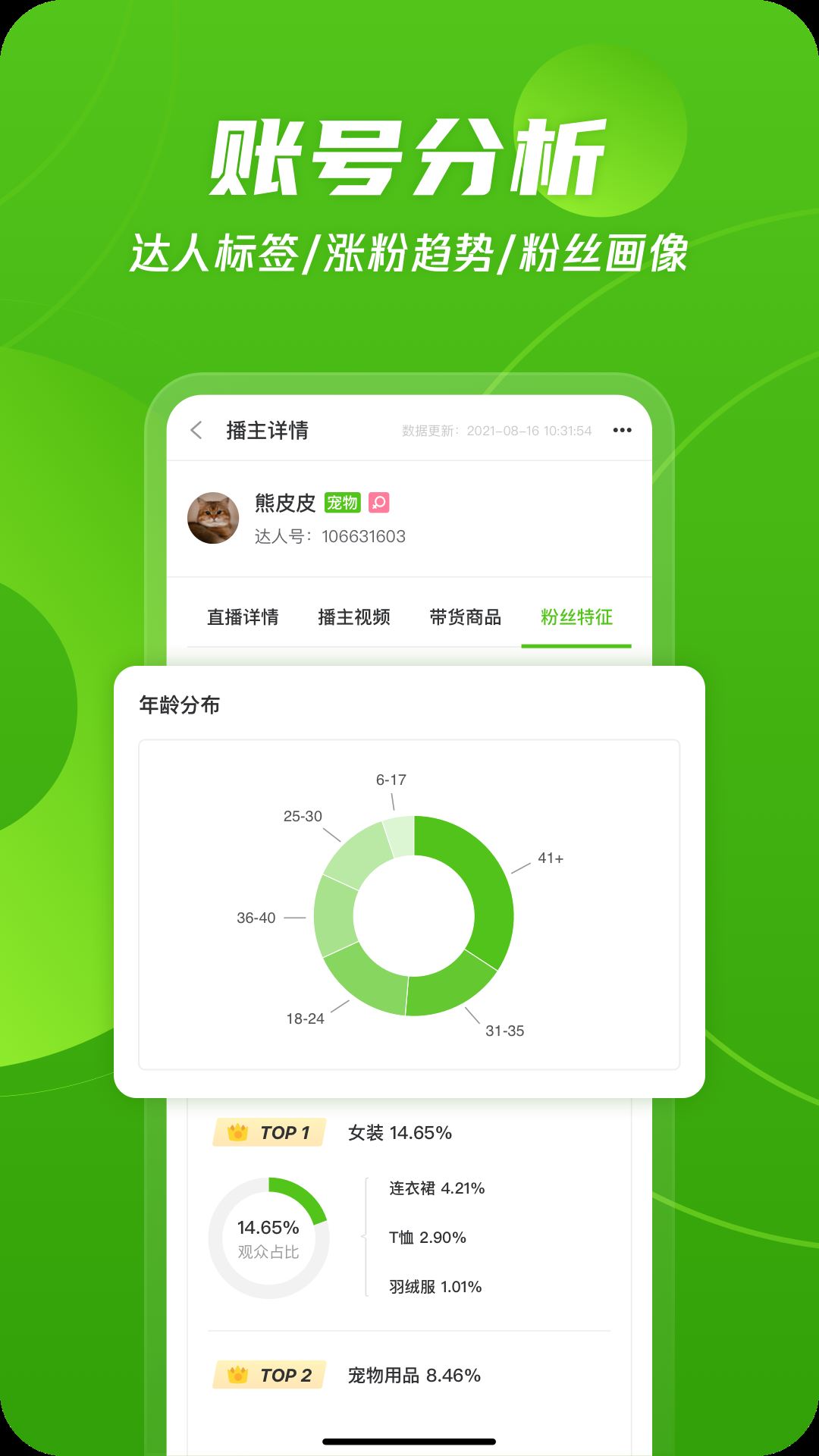 易投屏安卓版1.6.0安卓版商务办公软件有哪些?商务办公软件_商务办公应用下载立即下载支持抖音达人账号+淘客选品+抖音直播带货全景数据分析,35+分类榜单查询。飞瓜专注抖音短视频直播电商数据,实时!准确!查直播、选商品、找达人,用飞瓜数据!利用数据分析为飞瓜数据用户提供进行抖音短视频带货选品,抖音投放数据分析等功能。支持统计带货直播间及联盟数据,帮助用户短视频轻松上热门,玩转涨粉带货操作技巧,捕捉短视频热点及潜力爆款商品、潜力直播间帮助用户完成短视频商业变现。1、达人分析:查看抖音涨粉趋势与特征,涵盖年龄分布、地区分布、活跃时间段、粉丝词云分析,达人关联视频、商品与直播数据分析。2、榜单排行:细分35个垂直行业抖音排行榜,成长排行榜及时发现优质潜力达人,企业榜、地区榜、直播榜、商品榜、小店榜、品牌榜满足多方位查询需求。3、电商分析:挖掘抖音短视频热卖商品及带货账号,实现精准选品,分析商品销量数据,发现热门带货视频与优质带货达人。4、直播分析:快速发现热门抖音直播间,还原播主历史直播和销售数据,监控直播正在购买弹幕人数,实现直播流量和电商变现5、行业大盘:每60s统计当前时段带货直播热度及实时观众热度、上架商品热度等数据,支持查看直播间各品类商品热度汇总数据,了解直播间卖货风向。【飞瓜数据】部分用户反馈 飞瓜是一款非常优秀的抖音直播助手工具。“解决了抖店、抖音盒子、巨量千川、巨量创意等平台只能查看自身数据的问题,可以查看其它mcn机构,主播带货数据,dou+投放feed流鲁班投放,以及京东淘宝天猫拼多多等商品信息。”“相比抖查查、蝉妈妈,卡思数据等同类产品。飞瓜优势在于数据的全面与准确性,更高的数据更新频率与算法优势。””快手等网红也要逐渐直播电商一体化,飞瓜为网红达人淘宝主播、MCN机构、抖店抖音小店淘宝卖家阿里巴巴1688飞瓜等不同领域的用户提供了短视频直播电商带货联盟全方位数据决方案。“