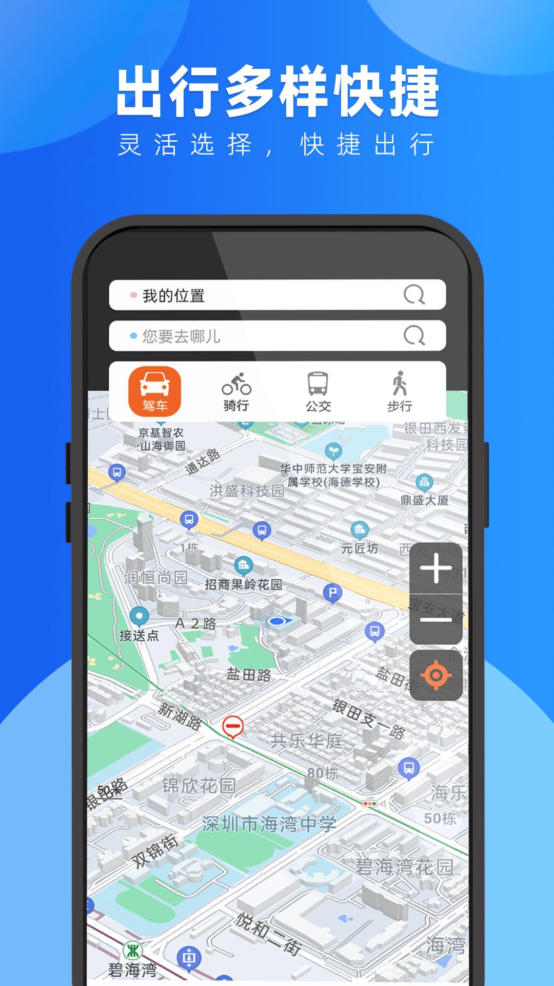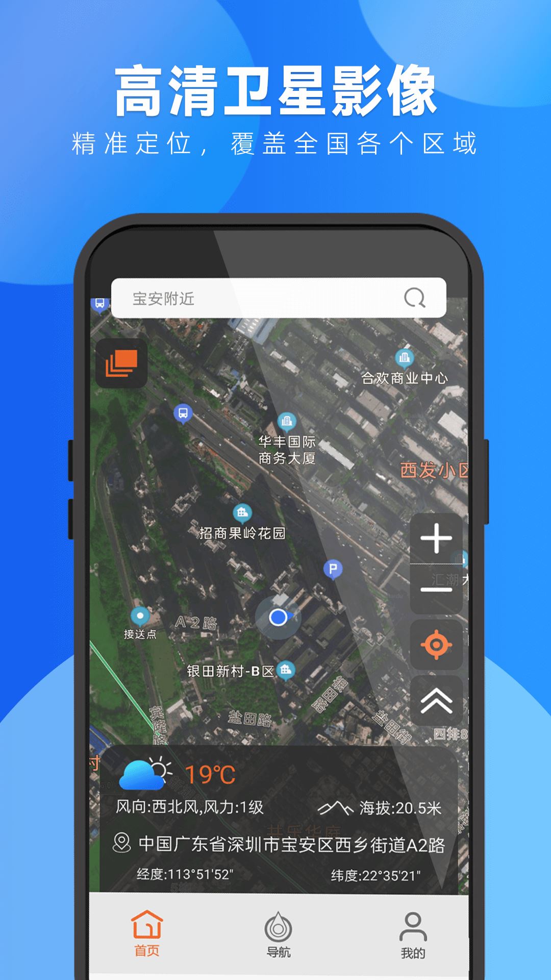 街景地图卫星导航能查看全国各地3D实景的GPS定位导航软件,可以实时查看您定位的地址的海拔高度,经纬度,天气情况等信息。还可以欣赏各地实景。可以定位到每一个村庄和城市小区观看实况。还有有卫星立体地图、还有平面地图、3D地图。能查看搜索附件的酒店、附近的厕所、附近的医院、附近的学校等等。同时还包括了热力图,离线地图,指南针,经纬度等功能。