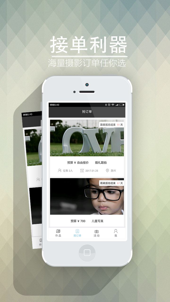 还在为订单来源发愁?在喔图通过抢订单功能,可以为你争取到全国范围海量的摄影订单。无论是活动跟拍、商品拍摄,还是个人写真、婚纱摄影,应有尽有。