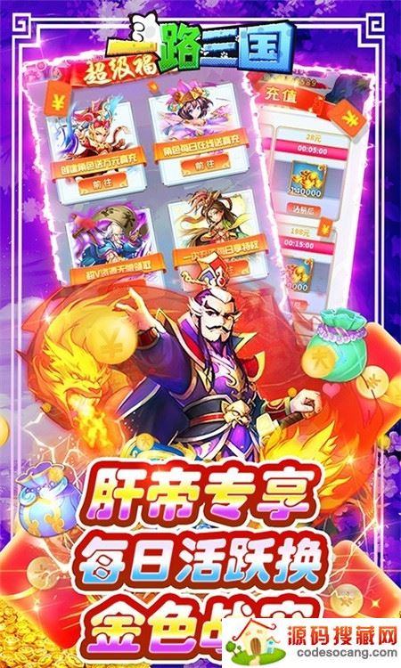 现在登录游戏创角就送满级VIP(VIP15)、一万元真充卡。次日送无双金将,三日送金色战宠,每日在线额外领2000元真充。新版还有无限资源特权免费激活。福利满满,让你不充值也能走土豪路线,赶快下载游戏和我一起决战三国之巅吧!