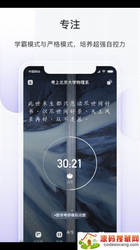 5.放下手机,高效专注——正计时、倒计时、番茄钟随心设置,时长可选,给你最大的自由度。多种专注背景、白噪音,自定义最佳专注氛围。同时满足学霸模式、严格模式、暂停时间的自主设置以及鼓励语个性定制,带给你最好的专注体验。