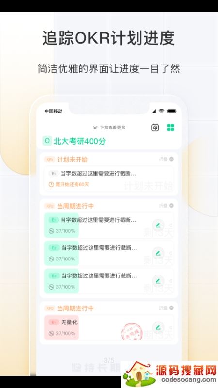 无广告的简洁页面,无需付费即可享有所有功能,通过OKR理念帮助你更好地分解目标、制定计划、高效执行,“坚持长期主义”,让你的成长更清晰可见。