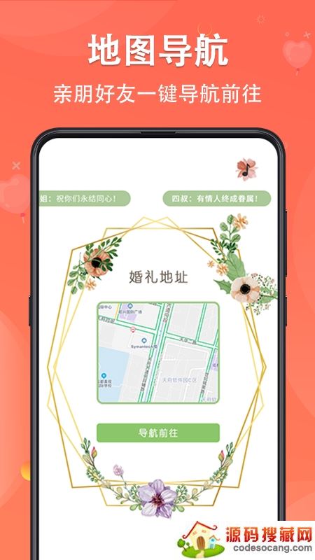请柬内置地图导航功能,一键导航,方便快捷!再也不用和朋友解释婚礼现场到底在哪了,电子地图一键导航显示具体婚宴地点的出行路线,一目了然。请帖制作完成后一键分享到qq、微信、微信朋友圈,及时传递您的幸福与喜悦。还能选择背景音乐,智能统计宾客回执信息,只为您提供便利。