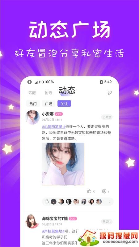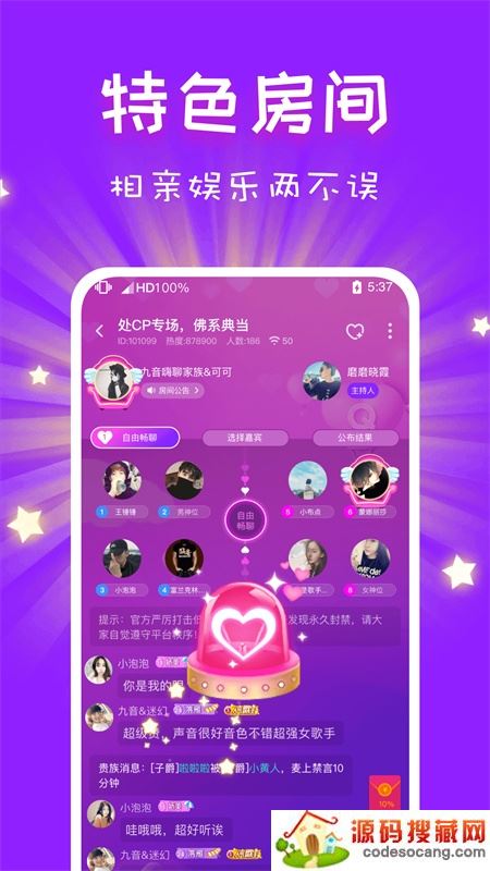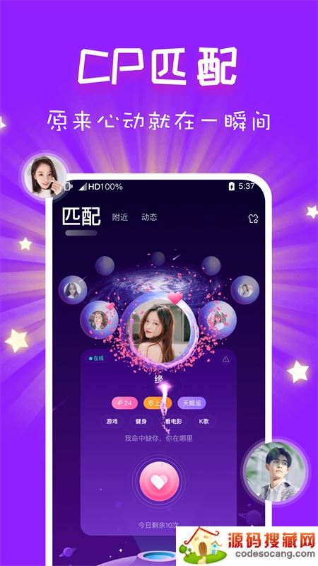 CP速配是一款年轻人的语音盛宴,主打语音交友,虚拟恋人。可以聊天,交友,秀才艺,找对象等。这里有主持,歌手,电台读文,pia戏等等一大群多才多艺的小伙伴哦,快来一起玩耍吧。