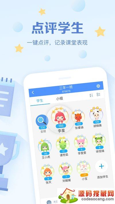 创建自己的班级,邀请学生及家长加入,海量有趣的卡通头像代表着每位学生,不管是在课堂还是在课余时间,都可以根据评语模板随时对学生进行多元化评价记录,老师不必花时间去统计总分,一切自动化并可同时同步给家长手机端,通过电子评价系统更好地管理班级