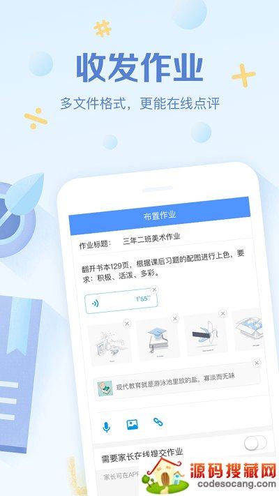 实时快捷布置作业,支持发送图片、语音、文字、视频、链接等内容。 例如把黑板作业拍摄下来发送给学生及家长,再也不用担心孩子记错作业内容。