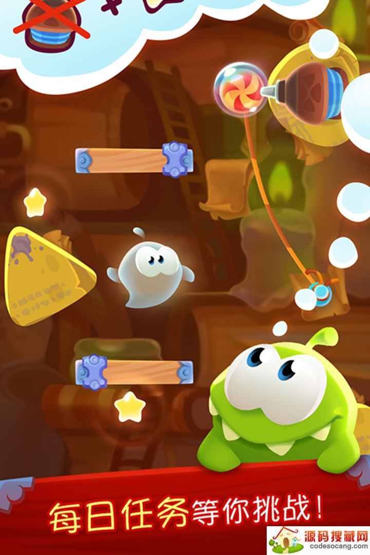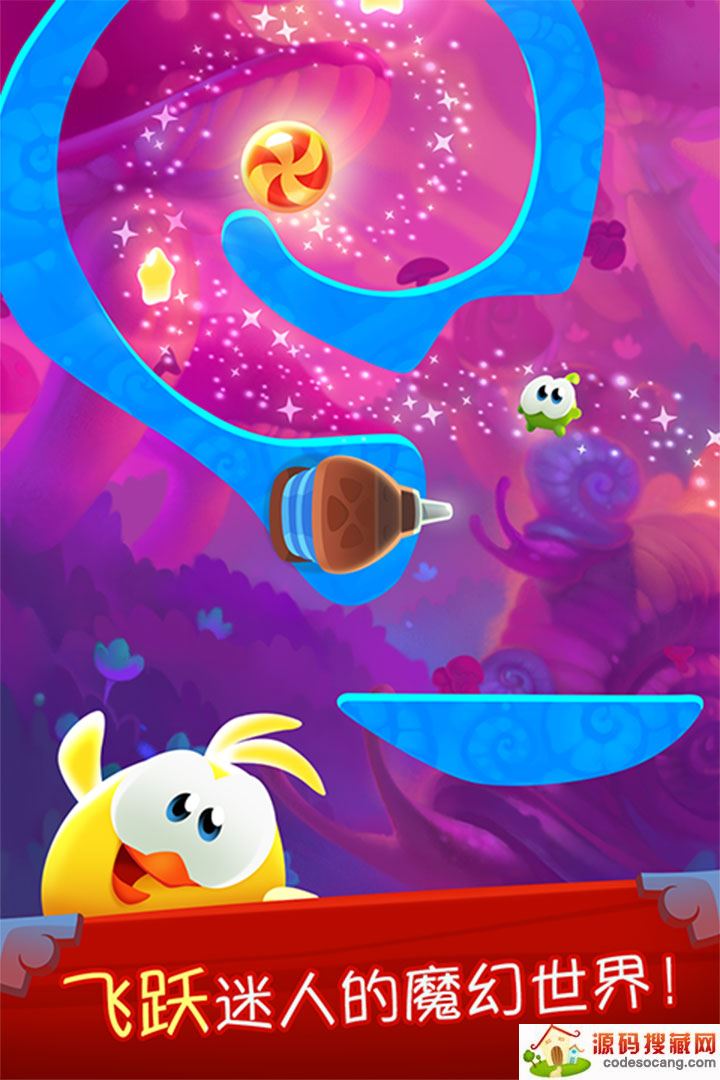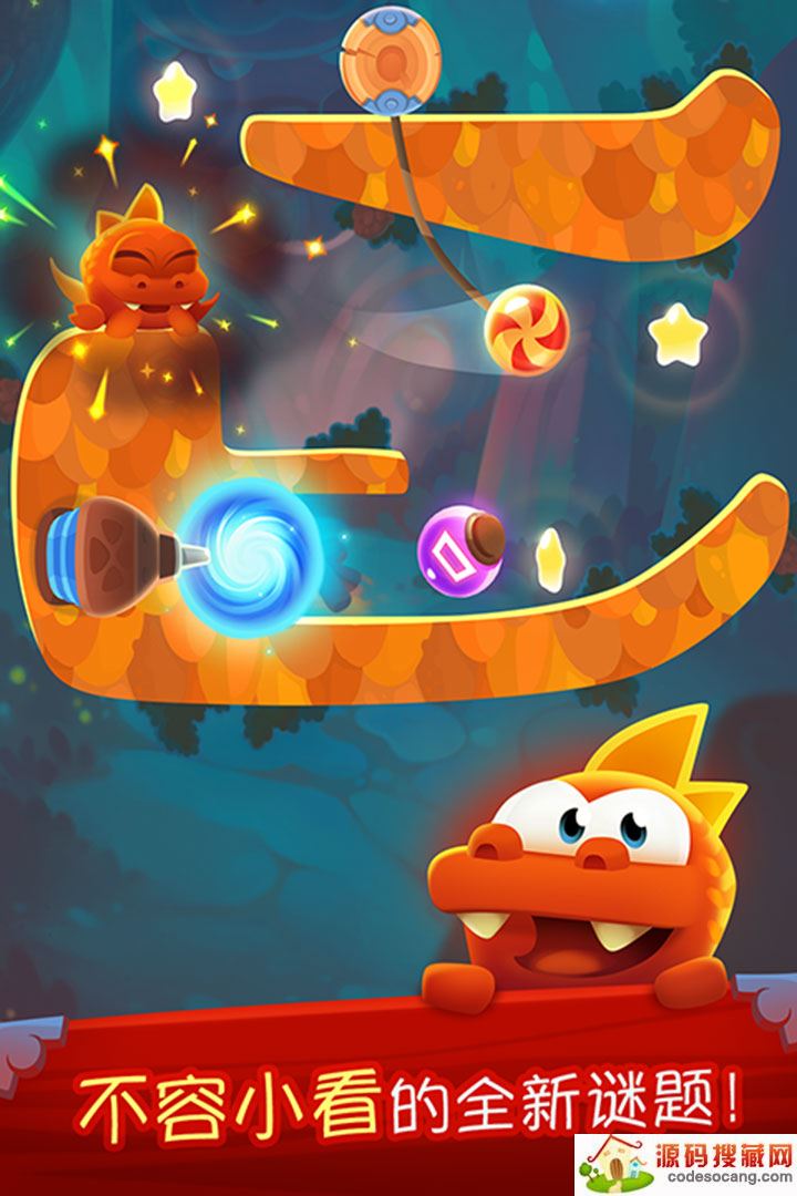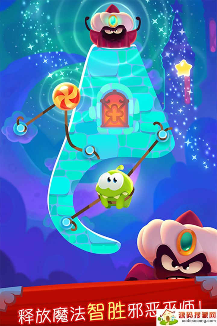 割绳子魔法游戏趣味性很强且有利于玩家智力激发,游戏在前作的基础之上,加入了全新的魔法元素,以一种崭新的姿态出现在玩家面前。更多奇怪的机关道具,就是用尽一切办法让玩家没那么轻松就收集到糖果甜点。快来挑战一下吧!进入游戏第一眼看到的依然是哪个可爱调皮的绿皮怪,大大的眼睛仿佛在欢迎大家再次回来一般。游戏采用了竖版2D的经典画面表现形式,主角依然那么小巧可爱,在背景上因为加入了魔法元素的原因,整个背景画面变得更为梦幻,特别是某些关卡甚至会出现一些星星光点,如梦如幻,就像来到浩瀚太空一样令人迷醉。游戏除了画面主题风格保持不变之外,操作上也继承了经典的全屏滑动特性,玩家们主要通过手指滑动屏幕来切割绳子,也可以通过点击来按住一些特殊道具,然后绳子所绑住的糖果或者其它物品都会在自然重力的影响下而运动。操作上保持了轻松悠闲的优点,又让玩家们能亲自参与进游戏中来,而且加上物理重力的影响,让玩家们能在游戏中体验到现实与虚幻互动的效果。