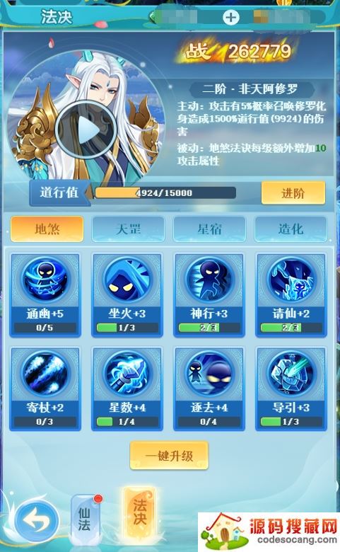 法决也是可以通过寻宝中获得,法决有主动和被动属性。法决阶级越高各项属性也会相应的增加,法决升阶是可通过收集或升级法决提高道行值来升阶。