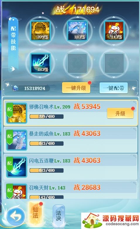 仙法,法决的数量决定了角色的各项属性的增加,也是增强战力方式。仙法可通过真气升级,真气可在游戏中的妖兽塔,跨服boos,群仙论道获得。
