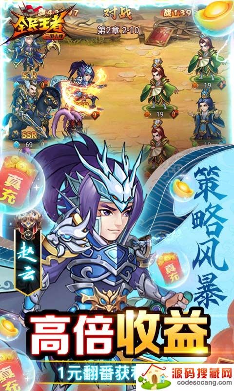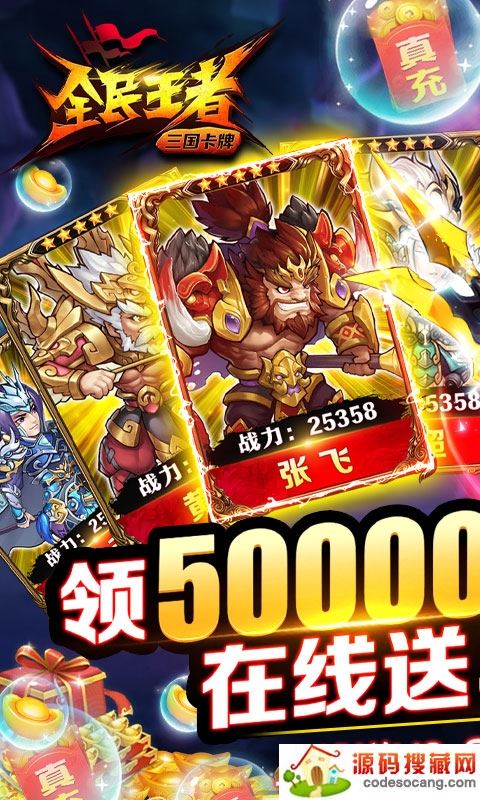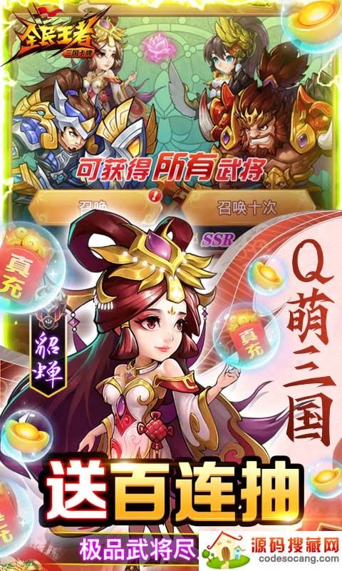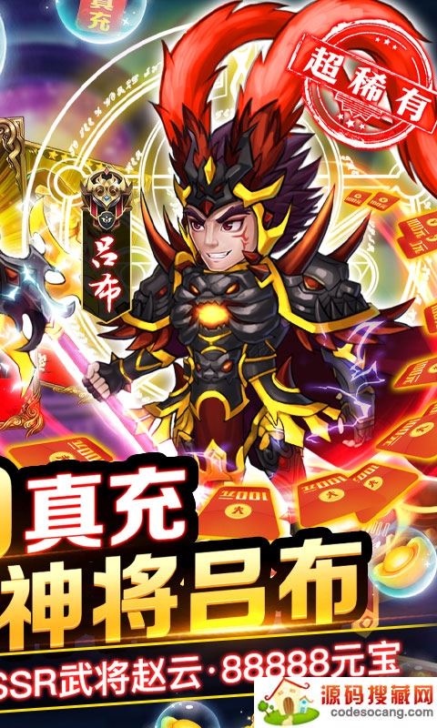 《全民王者(送万充吕布)》是一款以三国题材为背景的放置类卡牌游戏。登录送VIP8,送SSR武将赵云、88888元宝,再送珍稀材料礼包伴你闯荡三国!海量真充卡活动,各类豪礼拿到手软!游戏采用Q版日韩动漫风格,各个三国武将造型各有千秋。玩家可自由搭配武将,率领各路名将驰骋沙场,与对手一较高下!更多好玩的体验,欢迎进入《全民王者(送万充吕布)》的世界,体验全新的三国争霸之战!
