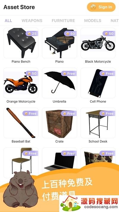 - 上百种免费及付费道具包,包含日系动漫风格的课桌椅,魔幻风的刀剑和盾牌等常用道具!您可以使用我们的应用内货币袋熊币购买模型和道具!