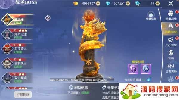 战场BOSS,除了日常任务,玩家还可以采集神龙柱和凤凰碑获得功勋和士气值;