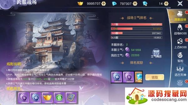 跨服战场,玩家每天可以进入跨服战场完成日常任务,获得大量的功勋值和士气值,便可在对应的商场购买各种丰富的奖励;