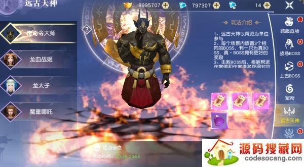 远古天神,每晚8点35分可通过限时活动进入挑战天神BOSS,可获得传奇令,天神碎片等奖励;