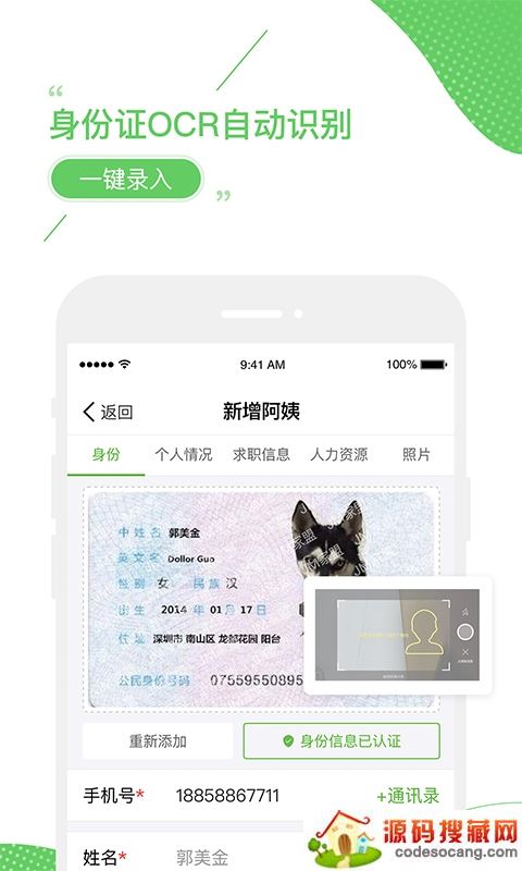 阿姨简历录入超方便,扫描阿姨身份证快速录入基本身份信息