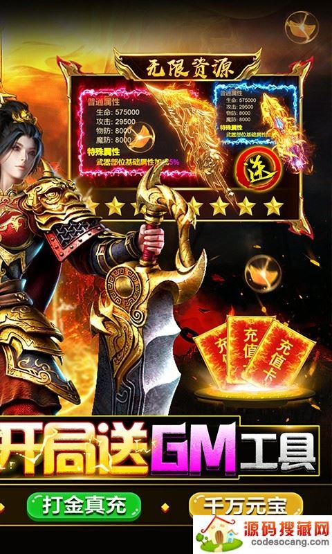 1、充值比例1:10000,上线输入GM666、GM777、GM888指令即可获得无限资源,无限刷充