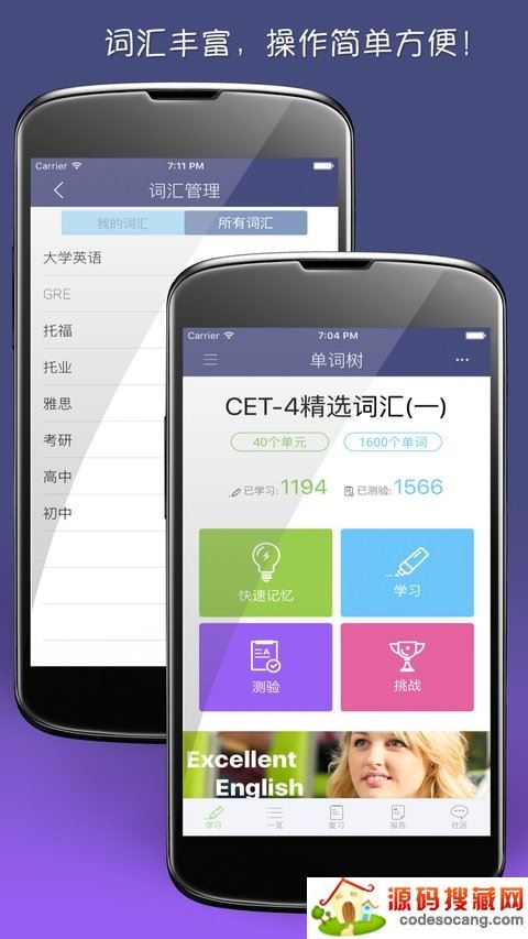 学习英语单词的利器、收录了大学英语四,六级,专四,专八,托福,托业,GRE,高中,初中等多种考试必备词汇!