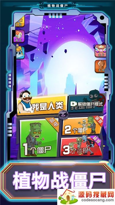 可以选择“我是人类”为玩家扮演戴夫,种植植物、升级防御塔抵御僵尸的模式;
