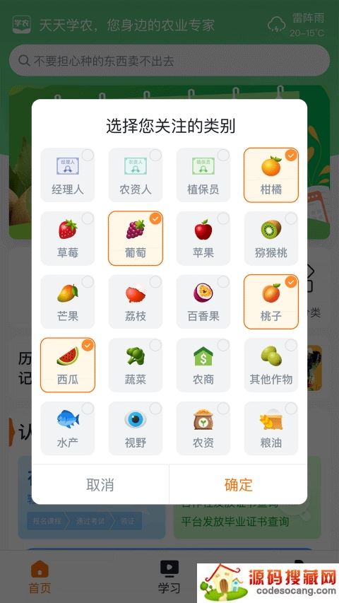 天天学农app是一款专注果蔬领域的农技知识学习软件,通过线上课堂为柑橘、猕猴桃、葡萄等种植户提供田间管理、病虫害防治等农技知识,助力广大种植户增产增收。