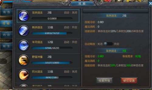玩家可以在技能界面浏览各个技能的介绍说明和升级技能。并且可通过“键位设置”按钮进入键位设置界面。在键位设置界面中可以自由设置技能的快捷键。