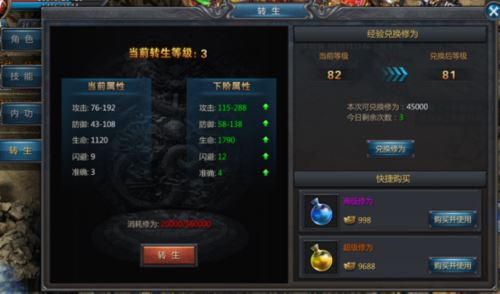 转生分为12个等级,等级越高可获得更多的各项属性加成,极大的提升角色的战斗力。每个转生等级均有相对应的转生装备,不仅拥有比普通装备更为华丽的外形,更有着十分强大的属性。转生等级提升需要消耗转生修为,可以通过活动、礼包、商城等得到的修为丹来获取修为,也可通过消耗经验和金币兑换大量修为。经过转生的角色可以进入更为危险的转生地图,与更强大的头目战斗,获得更为极品的装备与丰厚的稀有材料。