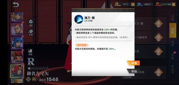 5、角色技能升级是养成角色的另一重要途径。只要有足够的资源就可对每个角色的普攻,奥义,天赋,援护四种技能进行升级,不同角色的技能优先级也有所不同,玩家可以根据角色自身情况选择所要提升的技能,部分技能在升级时,不仅仅加强技能伤害系数,还会提升技能特殊效果的触发概率!