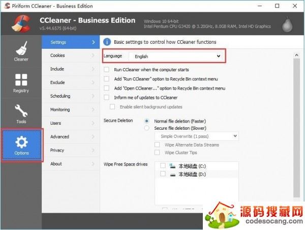 1、开启CCleaner假如默认设置页面是英语,能够在软件设定选择项中改动語言为中文,点击“Options(选择项)”按键,在“Settings(设定)”一栏中能够见到“Language(語言)”这一项。