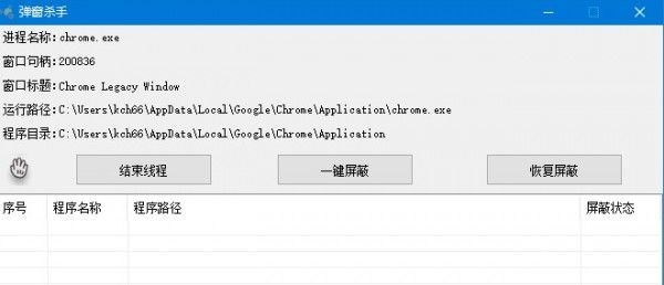开启软件根据拖拽手掌心标志挪动到对话框释放出来便会表明有关信息,随后能够挑选 完毕进程,或是一键屏蔽,或是恢复屏蔽一键屏蔽后会变更寻找程序流程途径更改后缀.bak,与此同时添加到软件下边的非常列表框中,恢复屏蔽点一下下边列表框中的新项目就可以恢复,恢复后会删掉列表框内新项目,还有一件事!