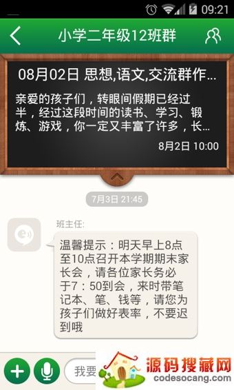 点击代班群(如:三年级2班群),进到群消息页面。可以查询教师公布的主题消息及其老师和家长的群聊天会话消息。