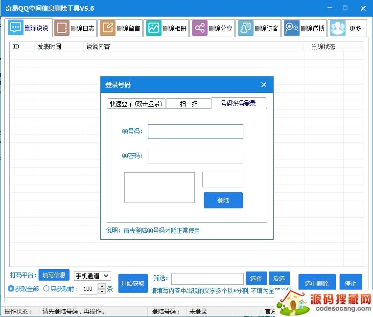 奇易QQ空间信息内容删除专用工具(大批量获得删除空间说说、日志、留言、相册图片、共享、访问量、个人收藏、和我相关、新浪微博、微信群主等作用),现阶段QQ空间说说等只有逐一删除,假如公布了几百条要删除将是一件十分复杂的事。