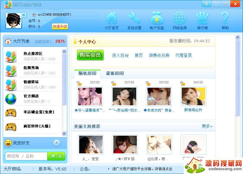 包含私人信息表明、聊天室系统分区列表、我的好友(好友列表)、屋子检索、手机客户端版本信息。