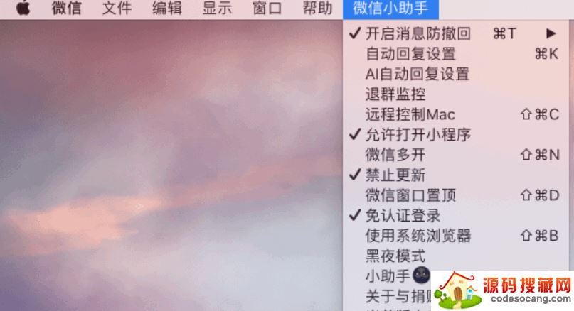 这也是一款适用Mac版的WeChat扩展作用插件,中文名字为微信小助手,这款插件想来很多人都使用过,其作用十分多,包含自动回复、信息防撤回、远程操作、微信双开、登陆免验证、对话多选删掉等。