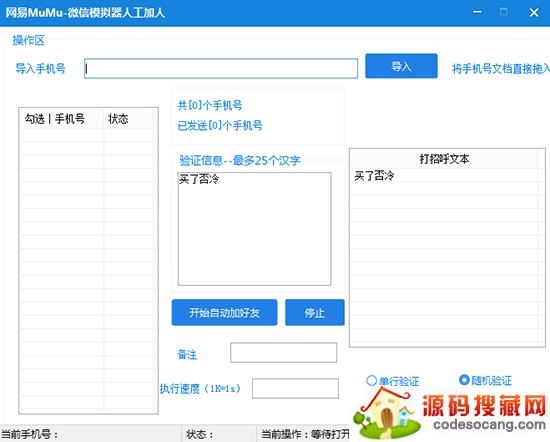 网易MuMu模拟器手机微信全自动加人软件是一款实用的手机微信微信自动加人专用工具,只要将手机号码文本文档立即拖进软件就可以,必须和网易MuMu模拟器配搭应用,可以完成快速加好友,还能够挑选其他信息,如是不是挑选女士,适用设定认证信息内容,十分实用。