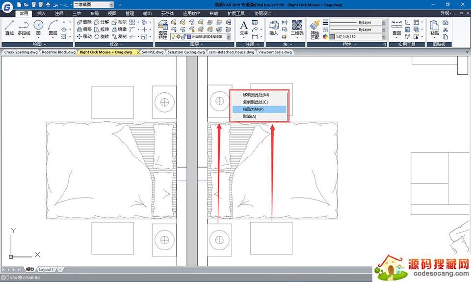挑选图型后,鼠标光标驻留在图型上按着鼠标点击拖拽,可以将图型挪动、拷贝或黏贴为块。