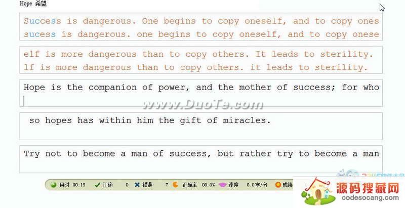 阿珊打字通是一款完全免费中英入录训练和测试工具,给予当地、互联网技术、内网等多种多样测试方案,统一收发考卷。训练层面给予当今英语关键词释意和中文拼音/五笔码查取。记分选用及时速率和准确度综合性纪录。训练原材料包含一个字、短语和经典短文;互联网技术文章内容自动更新并且做好全国排名;内网方式下服务器端能够即时查询登陆状况和考试成绩、收发考卷并导出来为Excel报表。群聊方式能够让教师等管理人员在互联网技术上设定考試原材料和标准,完成跨主机房、跨院校、跨区域的统一考試。还能够运用群聊作用布局课外作业和假期工作等,管理人员能够对原材料自动更新。
