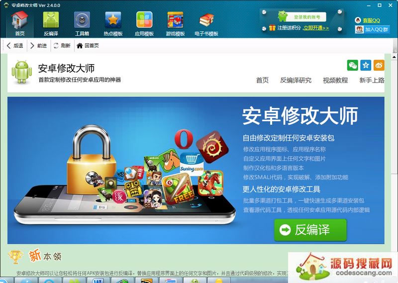 2、拥有海量安卓应用和游戏的模板,方便反编译:提供海量最新最全的应用作为定制模板,可以直接下载后进行反向工程、、修改、查看源代码、查看安装包信息等操作(部分应用由于做了加固,暂时不能进行反向工程)。