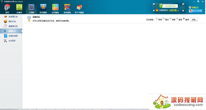 7、内置Log等调试工具,方便应用进程、logcat输出查看等进阶操作,监测修改apk的运行状况,以助于分析和查找错误。