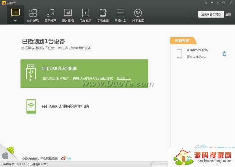 91助手V5iPhone&安卓版,是一款通过电脑管理iPhone、iPad、Android Phone、Android Pad等多种智能设备的PC端软件,全面支持苹果、安卓等智能手机操作系统。使用91助手3 iPhone&安卓版,通过电脑即可轻松管理智能手机,下载海量的手机游戏、手机软件、手机音乐、手机铃声、手机壁纸、手机主题、手机电影等各种手机应用,大大节省手机流量。91助手3 iPhone&安卓版,还有一键转机、手机备份还原、手机联系人管理、手机短信管理、文件管理、手机截屏、手机同屏等手机管理功能,简洁易用。泡91,淘应用,轻松享受智能生活!