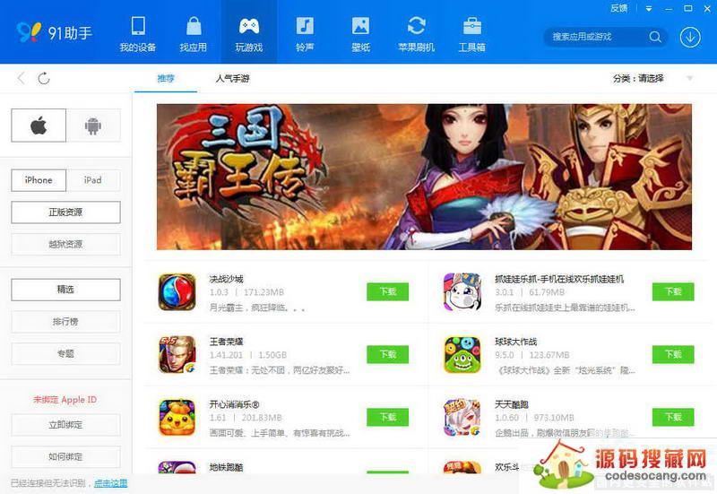 91助手PC端新版震撼推出啦!91助手是一款通过电脑管理iPhone、iPad、Android Phone、Android Pad等多种智能设备的PC端软件,全面支持苹果、安卓等智能手机操作系统。使用91助手,通过电脑即可轻松管理智能手机,下载海量的手机游戏、软件、音乐铃声、壁纸主题、电影视频等各种手机应用,大大节省手机流量。同时还有手机联系人管理、资料备份还原等手机管理功能。91助手V5版,更快速,更便捷,更实用!2345软件大全提供91手机助手安卓版官方下载,91手机助手安卓版PC版下载。