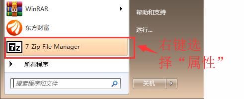 ①打开屏幕左下方的“Windows开始”,在左侧程序列表中找到【7-Zip File Manager】,鼠标右键选择“属性”;