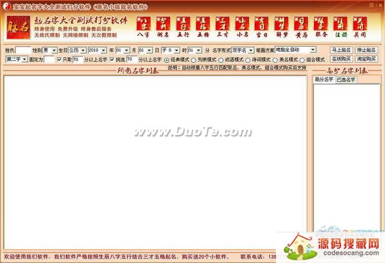 软件分经典模式高分起名、列表模式详细起名、成语模式寓意起名、诗词模式起名、自定义文字组合起名、美名模式好听起名等。软件可以对不同姓氏自动生成100000以上的名字,软件可根据用户的选择,固定名字的第二字或第三个字,可以选择不同笔划的优先组合规则,只起N(例如95)分以上的名字,也可以自动筛选高分名字到高分列表,然后可以查看每个名字的详细分析。另外也可以设置最低起多少分数,减少筛选的时间。