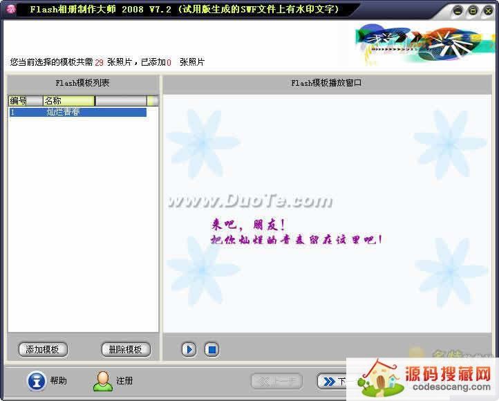 点击“添加模板”按钮,在弹出的打开文件对话框中选中我们给您提供的Flash模板后点击“打开”按钮,即可把模板添加到软件中。您可以预览模板的效果,选中模板后点击“下一步”。