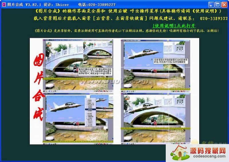 《图片合成》的操作界面是全屏和 使用右键 呼出操作菜单;目的是充分使用屏幕来显示图形;左键操作是 拖动 / 移动 / 选择 / 绘画 ;右键操作是 呼出操作菜单 / (放大 / 缩小前景图)。