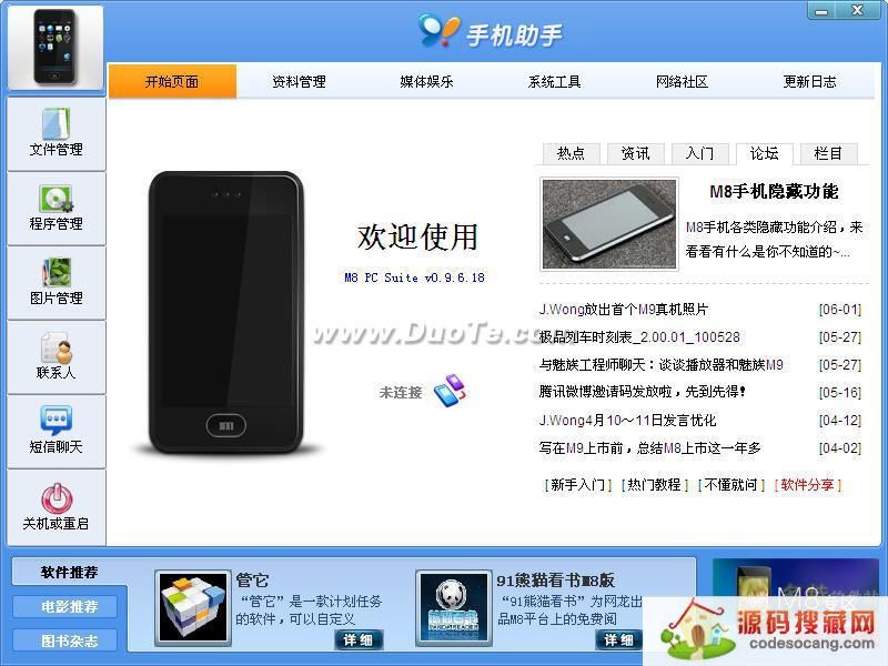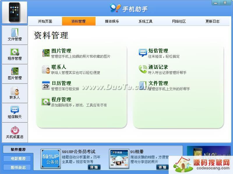 资料管理:联系人管理、电脑收发管理短信、定制日程、管理任务