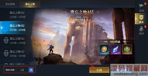 遗忘之地分为19层,解锁关卡需达到对应的等级,关卡等级越高,通关所获得的奖励越丰富。每日有2次免费挑战机会,挑战次数可额外进行购买。当以SSS的评价通过关卡时,可解锁扫荡功能,后续可以直接扫荡,无需再挑战(扫荡获取的奖励与SSS通关奖励一致)。