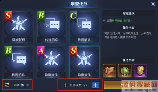 1、联盟任务按难度可分为S、A、B、C级,完成难度越高的任务可获得更丰富的奖励。每日有5次免费任务次数,任务次数可额外进行购买。每日有5次免费刷新次数,刷新可将6个联盟任务重新随机,刷新次数可额外进行购买。