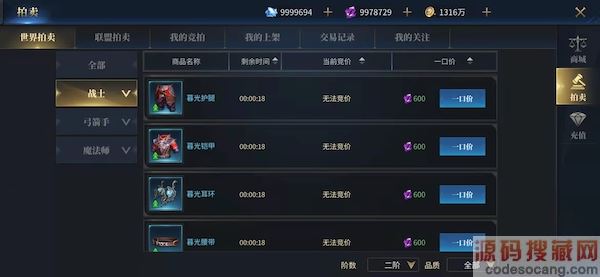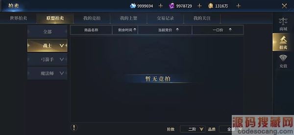 世界拍卖是主要的拍卖行场景,在左侧界面可以通过职业进行选择,点击某职业的下拉菜单,即可选择该职业不同位置的装备。下方“阶数”可以选择不同品阶的装备,“品质”可以按不同的品质进行筛选。